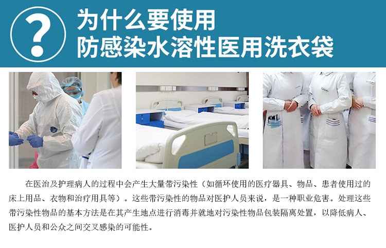 水溶性醫(yī)用織物袋(水溶性防感染醫(yī)用織物處置袋)主要特點(diǎn)防止交叉感染,傳統(tǒng)的PE袋做的衣物收集袋因?yàn)槠洳?a href="/zh/productlist.aspx?classid=010104" target="_self" title="點(diǎn)擊打開(kāi)相關(guān)產(chǎn)品。">溶解于水,需要工作人員用手去把贓物(可能帶有病毒、細(xì)菌和化學(xué)品的污染)從PE袋中拿出來(lái),放入洗衣機(jī),這樣容易受到感染,而PVOH醫(yī)院感染科專(zhuān)用洗衣袋可溶于40℃以上的水中,可直接把用“織物防感染水溶袋”放入洗衣機(jī)中,不容易受到感染,減少操作人員被感染的風(fēng)險(xiǎn)。水溶性醫(yī)院感染科織物防感染處置產(chǎn)品包括醫(yī)院感染科專(zhuān)用洗衣袋(織物防感染水溶袋)、防感染織物收集車(chē)和水溶定量洗滌/消毒劑包裝產(chǎn)品等,產(chǎn)品主要用于包裝、消毒、洗滌醫(yī)院感染科或職業(yè)病危害因素作業(yè)場(chǎng)所的日常工作過(guò)程中產(chǎn)生的大量帶有潛在生物或化學(xué)污染風(fēng)險(xiǎn)的可重復(fù)使用的織物,能很大限度地降低病毒、細(xì)菌和化學(xué)品的污染和傳播,減少操作人員、患者和污染物之間發(fā)生的交叉污染的風(fēng)險(xiǎn),有效地減少對(duì)人員及工作環(huán)境的傷害,應(yīng)用水溶性防感染織物防感染處置產(chǎn)品處理包裝醫(yī)院感染科或職業(yè)病危害因素作業(yè)場(chǎng)所可重復(fù)使用織物是一種國(guó)際通用的流程化、標(biāo)準(zhǔn)化操作要求。