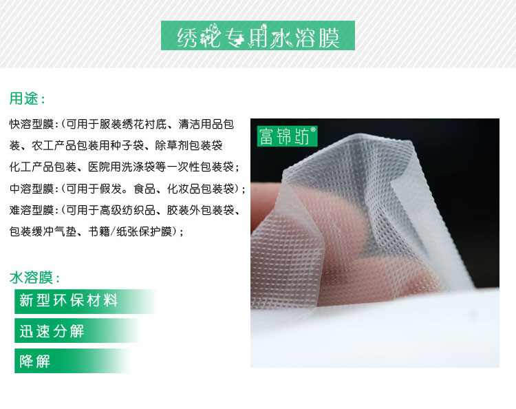 4、布料和繡花線的色澤是水溶膜的色澤決定因素,生產(chǎn)廠家一般只生產(chǎn)自然色的水溶膜,如果布料和繡花線是深色的也可訂做黑、紅、黃、藍(lán)、綠等色(但訂購量要大,一般工廠不愿做有色膜);