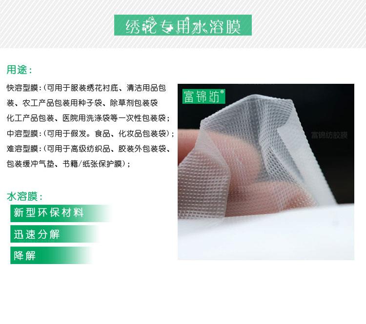 3、該薄膜有正、反面,正面光亮,反面暗淡,使用時(shí)擇優(yōu)選用,用在繡花時(shí),反面向下效果較好,水解時(shí)分三次水洗為佳;